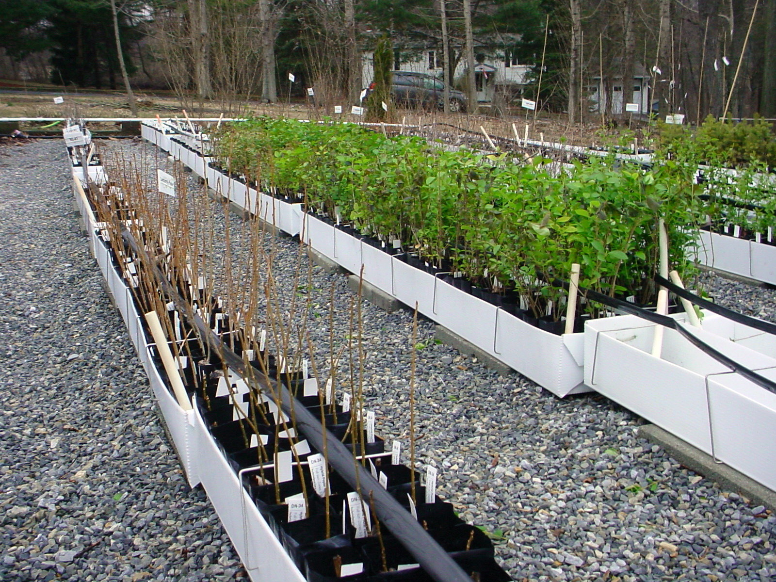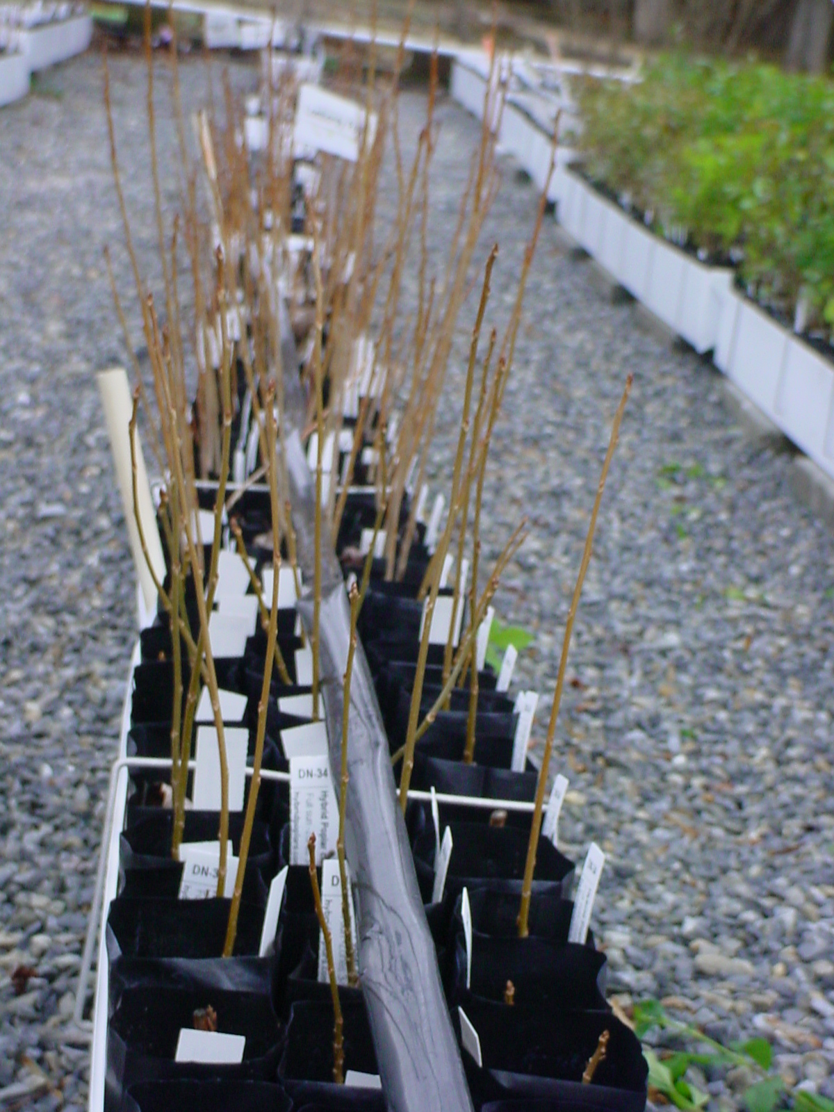 I plant cuttings in them, sometimes seeds or plugs. Many of the trees that I grow in them stay in the bags for several years. I have Blue Spruce , Red maples and Green Ash that have been in the bags for 3 years. I start with good medium, so I use Pro-mix, fill up the bags and add the cutting, seed or plug. Some trees and plants will not grow over 6 inches in the small bags. After doing a lot of observing, I came to the realization that the plants that do not grow over 6" are the ones that have a tap root. As soon as the root reaches the bottom of the bag, the plant stops growing. This includes: Privets, paulownia, dapple willow, mimosa tree, stevia and others that I have not identify yet. I am in the process of transplanting all the trees I have from that list to deeper (8") bags. The garden consists of 8 rows of 5 long plastic trays. These trays are 7 ft. by 7 inches. I put 110 bags in each tray (3 deep). Below are 3 photos of those 7 ft. trays and their contents. You can also see the drip irrigation hose running thru them. ![]()