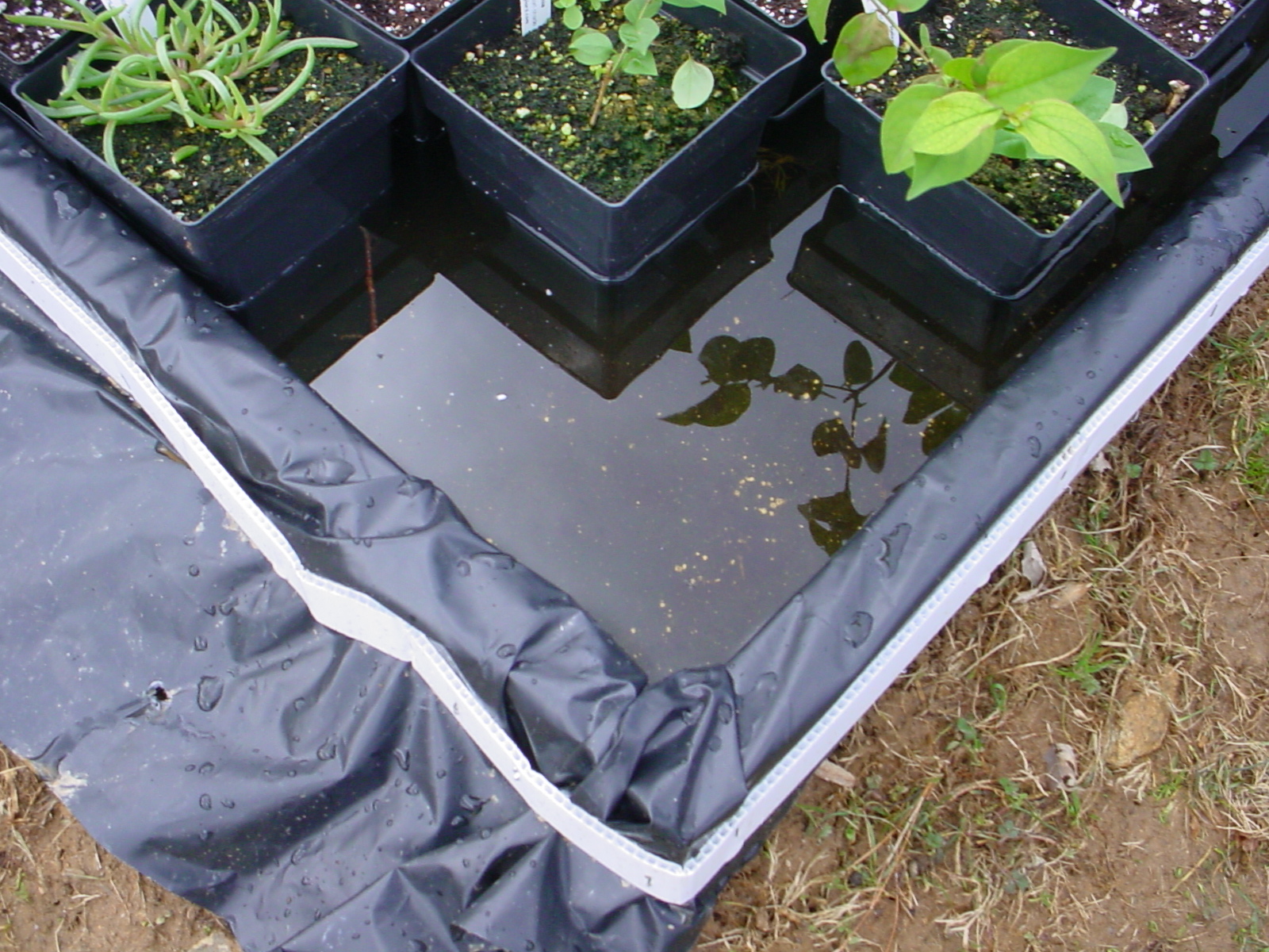 Watering these 40 long trays would be a mess if I did not have drip irrigation setup so all I have to do is to turn the water on for 15 minutes and the entire garden is watered As you can see, my trees never touch the ground! Maybe that is the reason PA inspectors have left me alone for the last 4 years, they just send me my certificate, they know my plants are harmless even if I send them to Canada. Another factor that helps is that I keep Praying Mantis in the greenhouse. The mantis devour everything within sight. The Praying Mantis will be in my greenhouse from the end of March until well into November. I takle some of them and leave them in the garden. Usually I find one solitary mantis in the greenhouse and I release it. I can have up to 4000 trees growing in my garden at any one time. As trees are sold, I have to replace them, so I am growing more stuff every day. All of my business so far has been thru the Internet. All trees are sold in their bags and every tree being shipped goes with a small dose of fertilizer for a good start. This is not a new idea, I have a "pool" where I grow 300 hybrid poplars in one gallon containers. I have had that for over 3 years, As the trees are sold, I replace them with smaller ones. The tallest ones in that pool are 8 feet tall. I also just made another "pool" for 1/2 gallon containers. It has 400 1/2 gallon plastic containers and many more 1/8 gallon bags. I started with some very flat piece of ground 48 inches wide by about 25 ft long. I spent a couple of days making it perfectly level in all directions, and made a frame with 2x4s. On top of that, I put black 6 mil plastic (home depot) and then added the plants. How do you water them? put the hose in a corner, turn it on for 15 minutes. An hour later you can siphon the excess water. Here are a couple of photos I just took, it rained this morning so there is about an inch of water which I am siphoning.