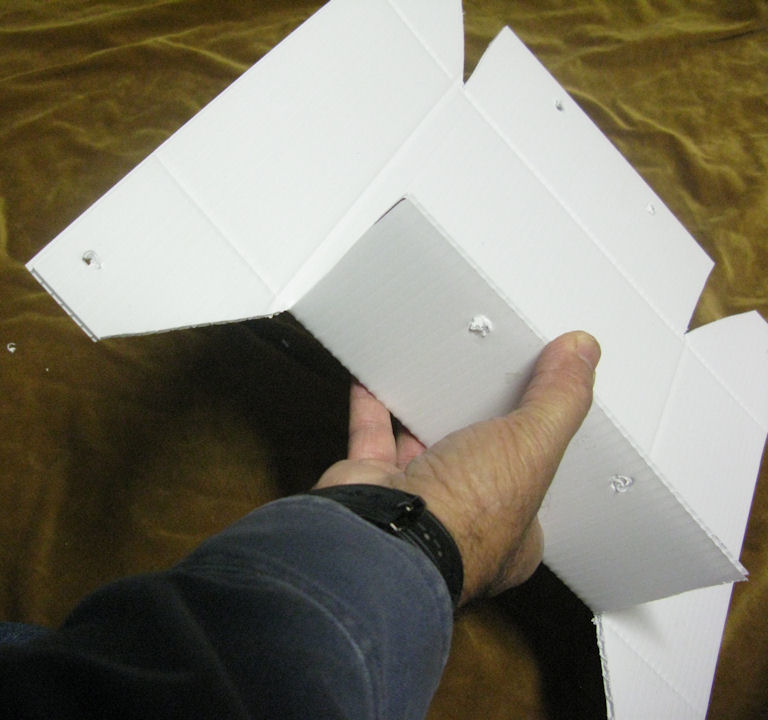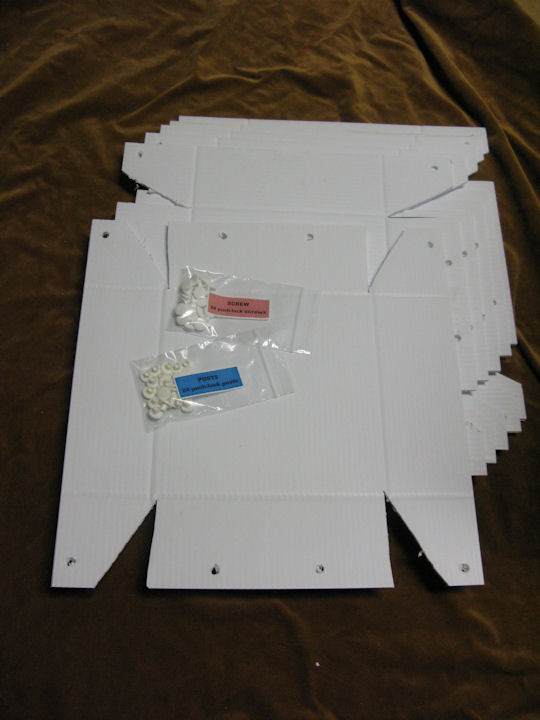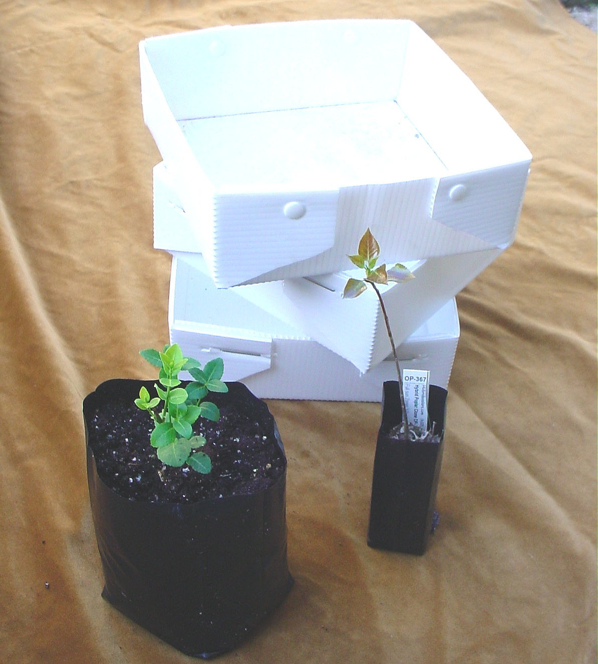 Some trees and plants will not grow over 6 inches in the small bags. After doing a lot of observing, I came to the realization that the plants that do not grow over 6" are the ones that have a tap root. As soon as the root reaches the bottom of the bag, the plant stops growing. This includes: paulownia, mimosa tree and others that I have not identify yet., however sometimes the root takes a turn and then the trees continue growing. Weird! The half gallon bags are 4X4X9 inches. Fill them to within an inch of the rim. These were designed for Perennials. The 1 gallon bags are 5x5x11 inches I use them for trees only, in fact I have sequoias and poplars in them. I am sending free samples of these bags, just send me an email with your name and address, and the word "bag" in the subject line. Please be sure the name is formatted so I can just cut it and stick it on an envelope. I will ship you all 3 sizes by return mail. The White Coroplast trays shown above fit 4 half gallon bags or 16 1/8 gallon bags and are available here. The trays are shipped to you flat, along with 24 male and 24 female fasteners.To assemble, first bend the large flap towards the inside (follow the creases) and then the larger flap over it. See photos. Insert a fastener in the hole in one side of the flaps and the opposite fastener in the other side and press them together. Now do the other 3 corners the same way. Reinforce the fasteners by pressing them together with a pair of pliers to just tap them with a hammer. The trays are not waterproof, however you can make them waterproof by adding a drop of "Goop" (Home Depot Paint Department) in each corner.