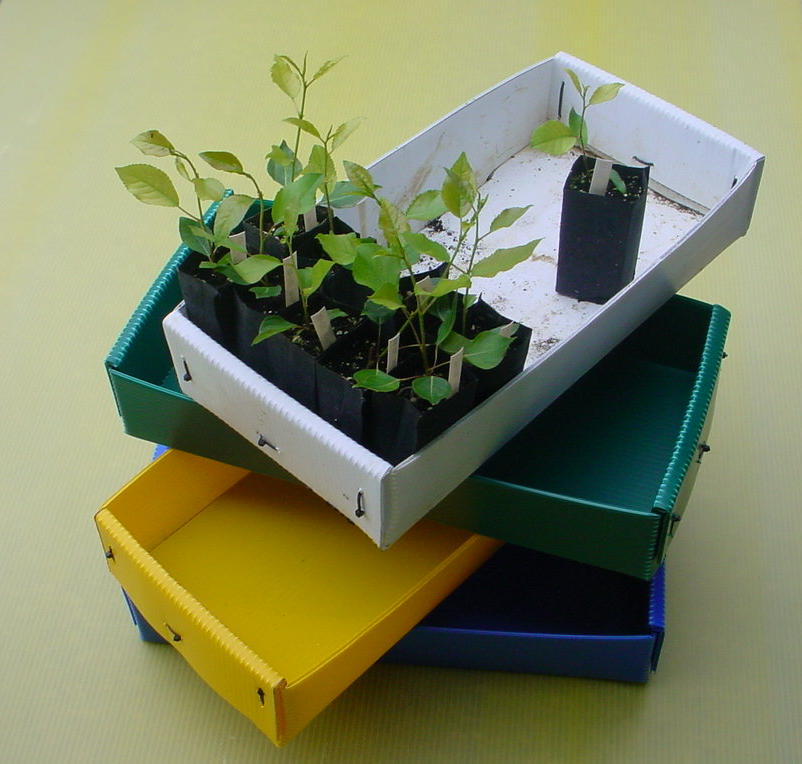 ![]() I could not function in my greenhouse without a bunch of these handy trays. I designed them so I could put 35 to 40 small bags in each. They fit 4 across on the greenhouse benches, and are light enough that I can pick them up without straining. These trays are made of a plastic sheet called Coroplast. It is the same product the bins and tubs the post office uses are made out of. Coroplast comes in a variety of colors and thicknesses. For more on Coroplast, please see the long tray page ![]()