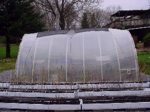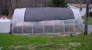 The film used to cover this greenhouse was purchased from the Hummert catalog- (800) 325-3055. There are several choices, look for one that will last at least 4 years, 6 mils thick, and 24 ft. wide. Also, this greenhouse film has to be UV protected.