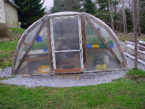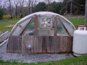 This information is being supplied without warranty of any kind, it contains all the steps I went thru to get my greenhouse up and running, and all the changes that I had to make to make it practical. I have been growing trees for a few years and selling them on the net. Someone gave me the idea that I should have a greenhouse to grow my own trees earlier in the season to have them ready by Spring time. I purchased some plans for $6 on Ebay. Probably those plans are still there. The main claim was "Build a greenhouse for less than $100". They did not lie. I got it up with less than $100, but that was only the beginning. I have been asked, would you do it the same again? No way. To start, you need to have a flat level piece of ground. Think floor. This is the first thing that should go in. A concrete slab would be what I would go with. The instructions call for 2 12X10X2 and 2 14X10X2 pieces of treated lumber. These boards would make up the perimeter of the greenhouse, and you would nail these to 4 4X4 pieces of wood buried in the ground about 3 ft deep. Since you start with the slab first, once it is cured (about 2 weeks) you attach the 12X10X2 and the 14X10X2 to the concrete with bolts. Attach them so they are flush with the top of the slab. The width of the greenhouse must be 12 ft. but the length can be any length you want up to 100 ft. My greenhouse is 12X14. The material you will buy to cover it comes in 100 ft. rolls.