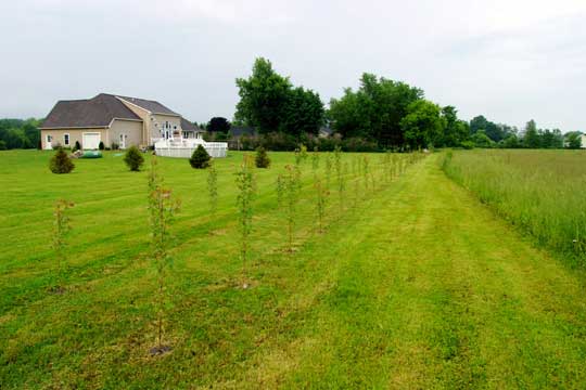 As you can see, I took your advice and did the shingle thing. I wish I did that last year. If people wonder, the trees are planted in two staggered rows, the rows are six foot apart and the trees are six feet apart, as per your instructions. If people ask, these are planted in Batavia, N.Y., about 30 miles east of Buffalo. Some of the trees are small, because I accidently weedwhacked a few of them, and this last fall and winter the deer found out they tasted great. After the damage was done, I used two applications of "Deer Off", on Thanksgiving and Valentines day....(three months apart). I think I will have to keep buying deer repellent yearly, until they get big. I'll probably be placing a small order soon to replace the 6 or so trees that I hurt with the trimmer. Thanks again for your help. I'll look forward to seeing my babies on your website. Frank D'Angelo I had lost these photos, another customer had them in his computer and sent them to me. Now you can se the before (2003) and the after (2008). 2003