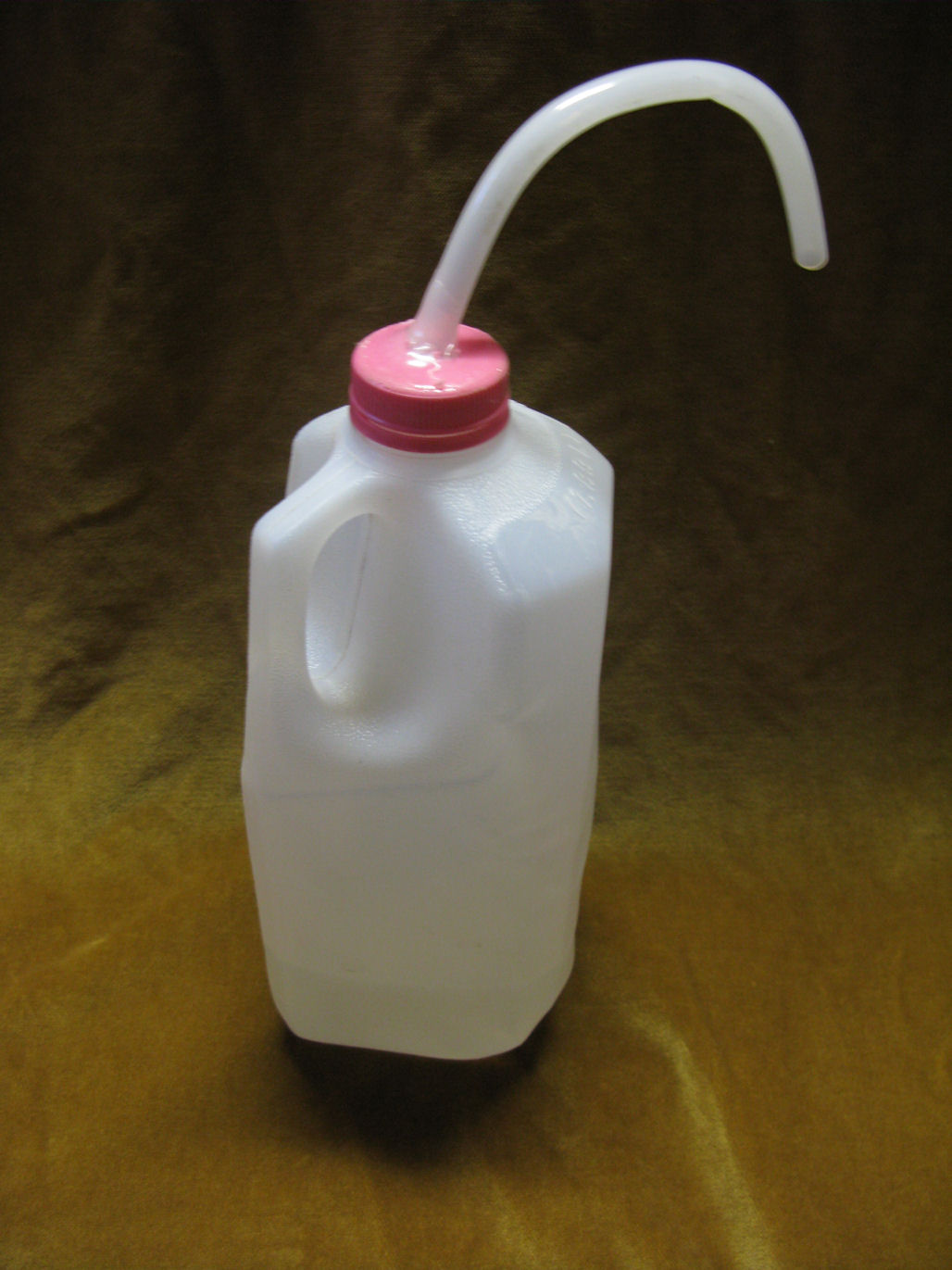| Another idea. I felt the need to have a watering device for the rooterpots because it is difficult sometimes to reach overhead to get to the ones that are 7 ft. high. This is what I came up with. I used a half gallon milk jug and added a piece of stiff plastic hose (Home Depot). the hole in the lid is undersized, that will give it a good fit, after that you can put some glue on both sides of the lid. I bent the hose with heat. The hose must reach the bottom of the bottle for it to work. To use it just squeeze the bottle. | ![]() |