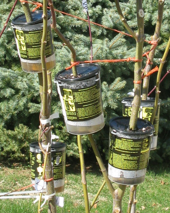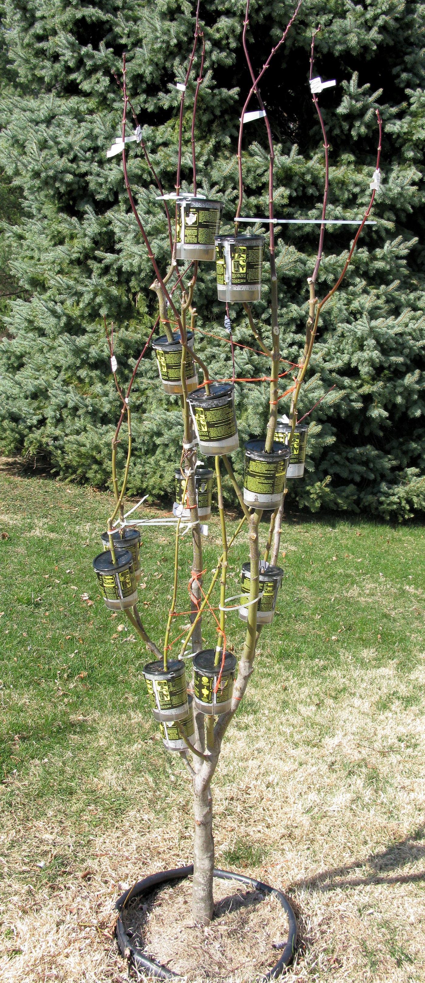 This is my first experiment with Rooterpots. This was an 8 ft. tall Red Japanese Maple, We removed every branch that did not look like it belonged for my purposes. Then we put pieces of tape where we figured we should have rooterpots and more tape of another color where we felt grafts should go. To finish, we added 13 rooterpots to those strategic points. Yes, we used a lot of twine in the process. Since today is March 31st, we must now wait until the danger of frost is over in order to do any grafting. In my area is May 10th . I have the laceleaf scions in the freezer at 28 degrees, I hope they survive. |