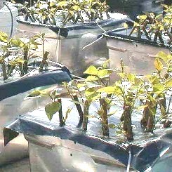 her research. T.Punshon & D.C.Adriano Phytoremediation is an alternative clean-up technology that exploits the action of plants and their associated microbes to alleviate hazardous soil contamination. Research has shown that certain plant species are adapted to growth in soils contaminated with heavy metals (such as nickel, lead, zinc and copper) and organic contaminants such as trinitrotoluene (TNT), trichloroethylene (TCE). Careful selection of the species of plant used can lead to removal of heavy metals and the degradation of organic compounds, leaving the soil significantly cleaner. Research at the University of Georgia's Savannah River Ecology Laboratory in Aiken, SC aims to develop a core Phytoremediation technology for mixed-waste contaminated profiles. The majority of Phytoremediation studies carried out in the past have concentrated on a single contaminant; for example the use of Indian mustard Brassica juncea to extract lead from contaminated soils. Phytotech The research at SREL aims to take Phytoremediation further toward a successful site deployment by studying the interactions between heavy metals and organics in the same profile. This is carried out by using solution culture techniques followed by pot studies, before moving into larger trials in the field. Poplars are the plant species of choice for the Phytoremediation studies due to recent findings suggesting they can take up and degrade organic contaminants and certain heavy metals. A group working primarily at the University of Washington have shown that the de-greasing agent TCE is degraded and transpired by hybrid poplar trichocarpa deltoides Furthermore, poplars and willows have been used for some time in Sweden as 'biological filters' to remove contaminants such as cadmium from sewage sludge while producing valuable bio mass, which is then turned into energy. The fast growth of poplar and willow trees makes them ideal Phytoremediation trees, due to their fast establishment, deep roots, rich associated fauna and most importantly their adaptability. It is expected that these types of trees will feature largely in Phytoremediation research in the future. Researchers Dr. Tracy Punshon and Dr. Domy C. Adriano are currently working to develop these fast-growing, adaptable trees into phytoremediators that are able to cope with a realistic mixture of contaminants. For more information, e-mail Tracy Punshon Note from Frank: Dr Punshon has graciously sent us the picture of some of the cuttings growing in her lab. If "Phytoremediation" gives you the creeps, don't worry it is a word meaning the art of picking up all the toxic waste we have spilled before it kills us. Some race... Not only we started late... but we are dumping faster than we are picking up! |